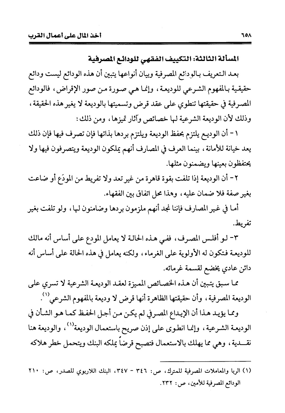(¬1) الرِّبَا والمعاملات المصرفية للمترك، ص: 346 - 347، البنك اللاربوي للصدر، ص:210 الودائع المصرفية للأمين، ص: 232.