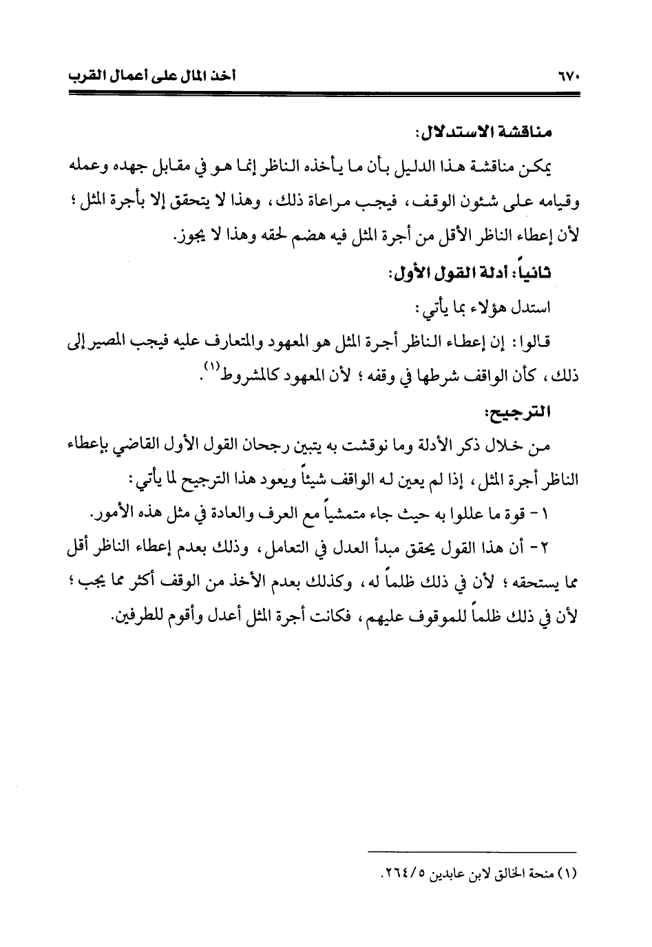 2 - أن هذا القول يحقق مبدأ العدل في التعامل، وذلك بعدم إعطاء الناظر أقل ممّا يستحقه؛ لأنَّ في ذلك ظلمًا له، وكذلك بعدم الأخذ من الوقف أكثر ممّا يجب؛ لأنّ في ذلك ظلمًا للموقوف عليهم، فكانت أجرة المثل أعدل وأقوم للطرفين.
