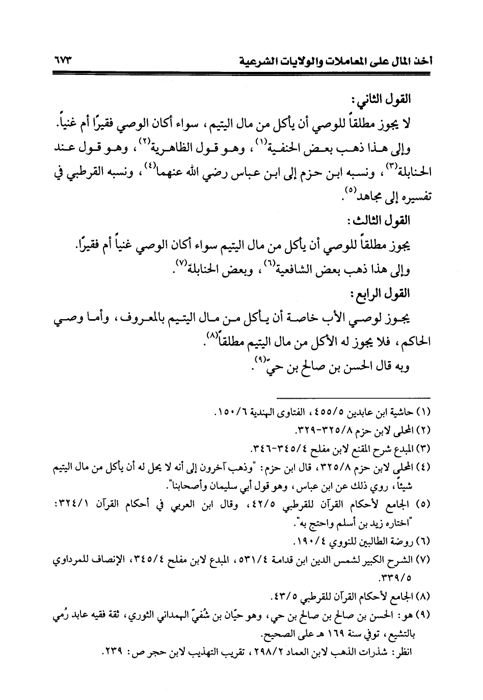 (¬4) المحلى لابن حزم 8/ 325، قال ابن حزم: "وذهب آخرون إلى أنّه لا يحل له أن يأكل من مال اليتيم شيئًا، روي ذلك عن ابن عبّاس، وهو قول أبي سليمان وأصحابنا".