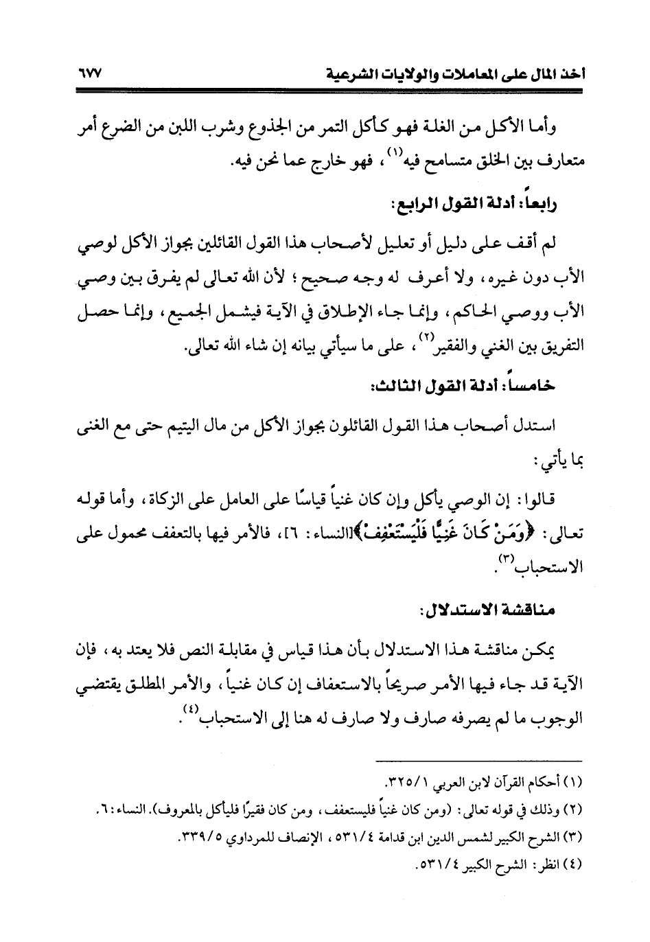 قالوا: إنَّ الوصي يأكل وإن كان غنيًا قياسًا على العامل على الزَّكاة، وأمّا قوله تعالى: {وَمَنْ كَانَ غَنِيًّا فَلْيَسْتَعْفِفْ} [النِّساء: 6]، فالأمر فيها بالتعفف محمول على الاستحباب (¬3).