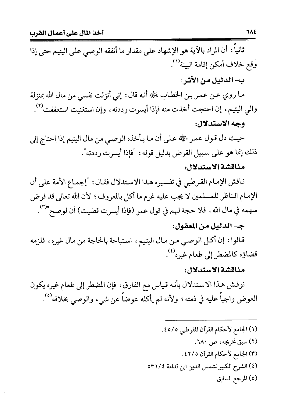 ناقش الإمام القرطبي في تفسيره هذا الاستدلال فقال: "إجماع الأُمَّة على أن الإمام الناظر للمسلمين لا يجب عليه غرم ما أكل بالمعروف؛ لأنَّ الله تعالى قد فرض سهمه في مال الله، فلا حجة لهم في قول عمر (فإذا أيسرت قضيت) أن لو صح" (¬3).