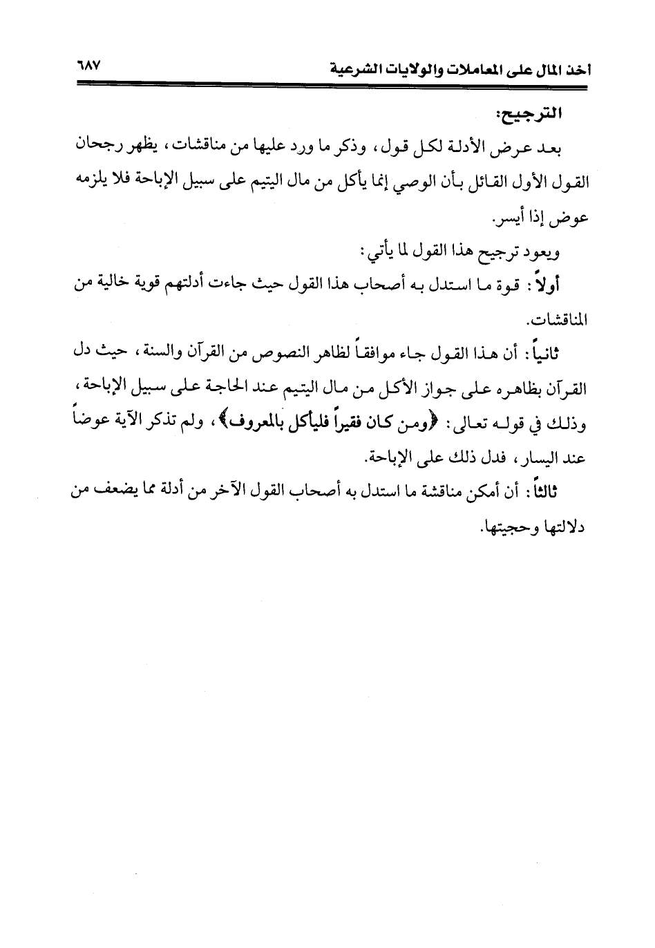 ثانيًا: أن هذا القول جاء موافقًا لظاهر النصوص من القرآن والسُّنَّة، حيث دل القرآن بظاهره على جواز الأكل من مال اليتيم عند الحاجة على سبيل الإباحة، وذلك في قوله تعالى: {وَمَنْ كَانَ فَقِيرًا فَلْيَأْكُلْ بِالْمَعْرُوفِ}، ولم تذكر الآية عوضًا عند اليسار، فدل ذلك على الإباحة.