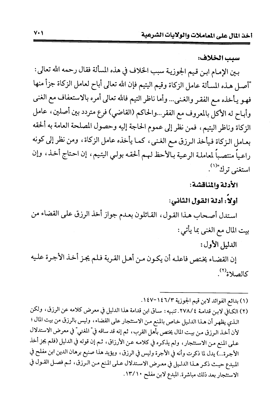 (¬2) الكافي لابن قدامة 4/ 278. تنبيه: ساق ابن قدامة هذا الدّليل في معرض كلامه عن الرزق، ولكن الّذي يظهر أن هذا الدّليل خاص بالمنع من الاستئجار على القضاء، وليس بالرزق من بيت المال؛ لأنّ أخذ الرزق من بيت المال يختص بأهل القرب، ثمّ إنّه قد ساقه في "المغني" في معرض الاستدلال على المنع من الاستئجار، ولم يذكره في كلامه عن الارزق، ثمّ إنَّ قوله في الدّليل (فلم يجز أخذ الأجرة ...) يدلُّ لما ذكرت وأنّه في الأجرة وليس في الرزق، ويؤيد هذا صنيع برهان الدِّين ابن مفلح في المبدع حيث ذكر هذا الدّليل في معرض الاستدلال على المنع من الرزق، ثمّ فصل القول في الاستئجار بعد ذلك مباشرة. المبدع لابن مفلح 10/ 13.