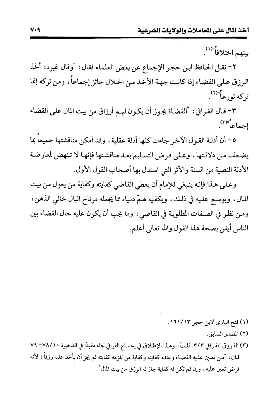 (¬3) الفروق للقرافي 3/ 3. قلتُ: وهذا الإطلاق في إجماع القرافي جاء مقيدًا في الذّخيرة 10/ 78 - 79 قال: "من تعين عليه القضاء وعنده كفايته وكفاية من تلزمه كفايته لم يجز أن يأخذ عليه رزقًا؛ لأنّه فرض تعين عليه، وإن لم تكن له كفاية جاز له الرزق من بيت المال".