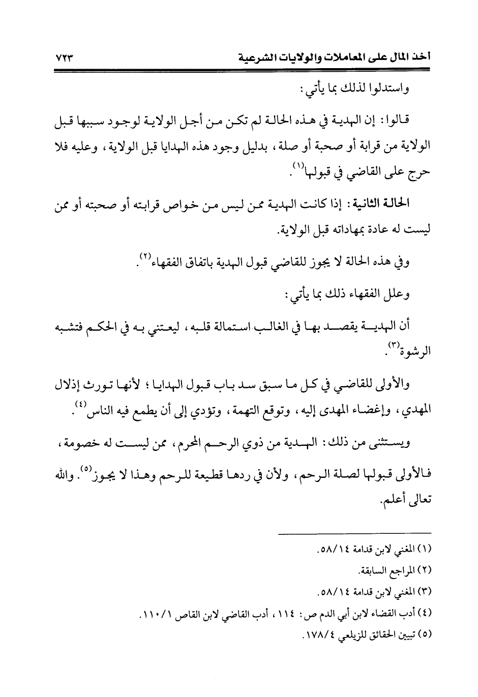 أن الهدية يقصد بها في الغالب استمالة قلبه، ليعتني به في الحكم فتشبه الرشوة (¬3).