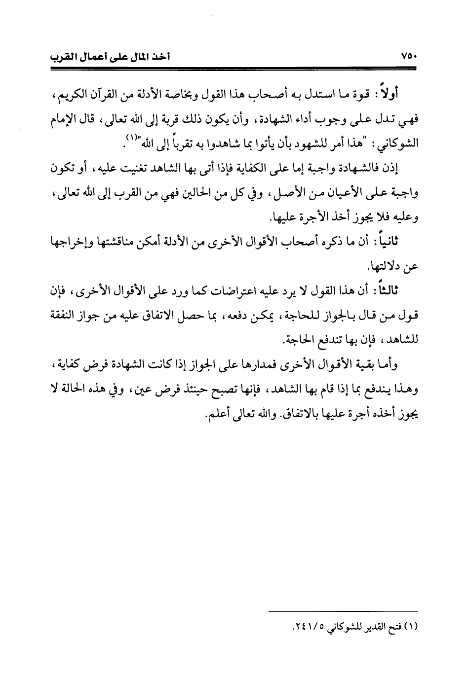 أوَّلًا: قوة ما استدل به أصحاب هذا القول وبخاصة الأدلة من القرآن الكريم، فهي تدل على وجوب أداء الشّهادة، وأن يكون ذلك قربة إلى الله تعالى، قال الإمام الشوكاني: "هذا أمر للشهود بأن يأتوا بما شاهدوا به تقربًا إلى الله" (¬1).
