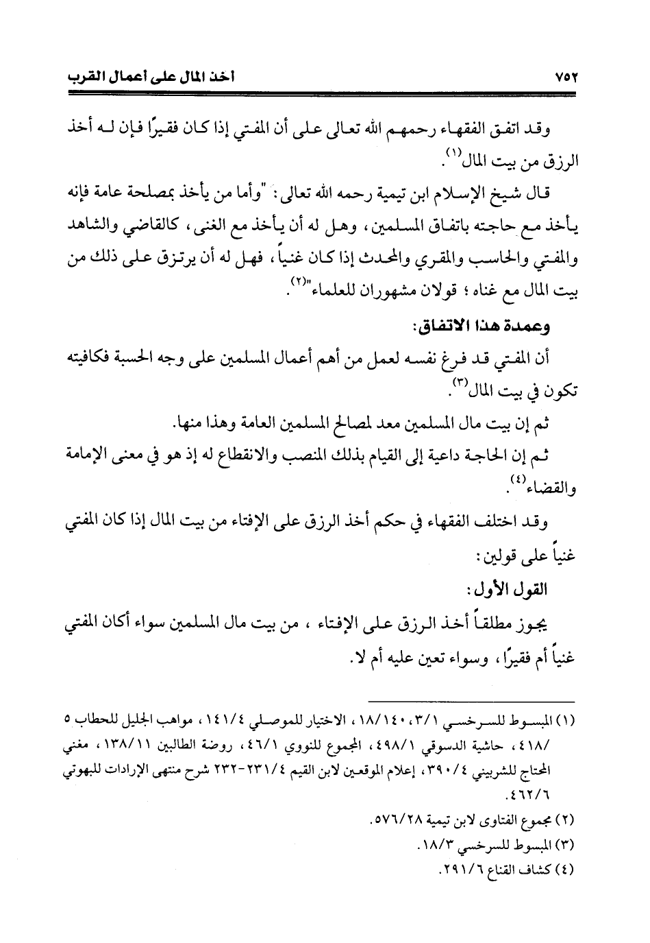 أن المفتي قد فرغ نفسه لعمل من أهم أعمال المسلمين على وجه الحسبة فكافيته تكون في بيت المال (¬3).