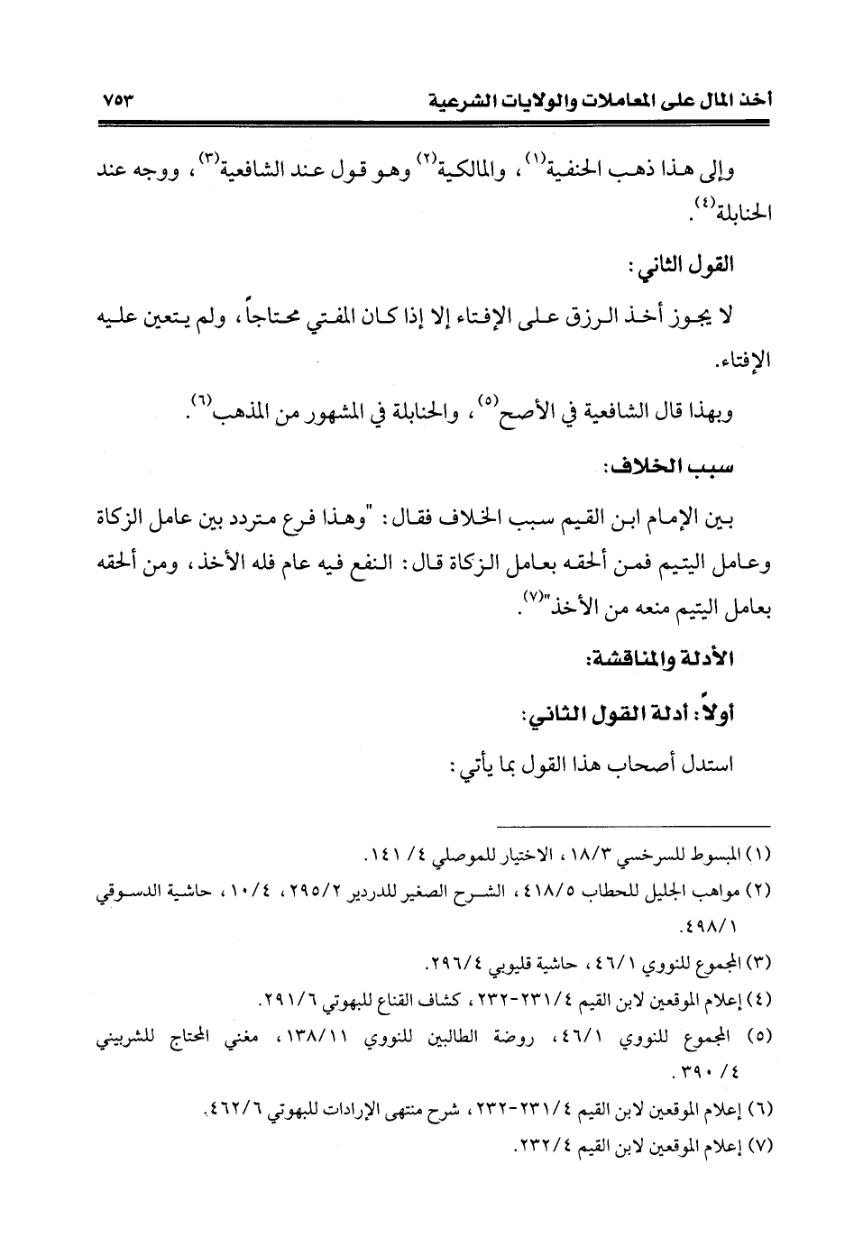 بين الإمام ابن القيم سبب الخلاف فقال: "وهذا فرع متردد بين عامل الزَّكاة وعامل اليتيم فمن ألحقه بعامل الزَّكاة قال: النفع فيه عام فله الأخذ، ومن ألحقه بعامل اليتيم منعه من الأخذ" (¬7).