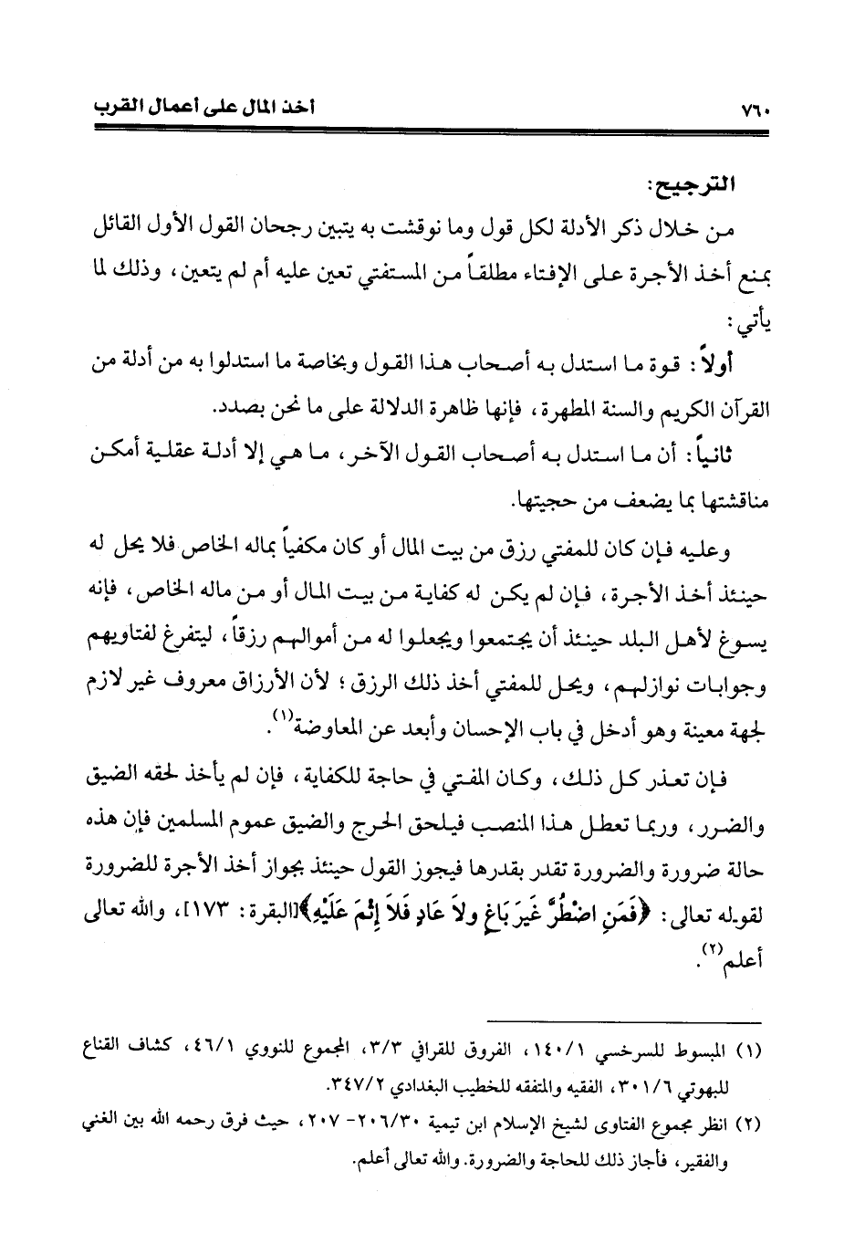 فإن تعذر كلّ ذلك، وكان المفتي في حاجة للكفاية، فإن لم يأخذ لحقه الضيق والضرر، وربما تعطل هذا المنصب فيلحق الحرج والضيق عموم المسلمين فإن هذه حالة ضرورة والضرورة تقدر بقدرها فيجوز القول حينئذ يحواز أخذ الأجرة للضرورة لقوله تعالى: {فَمَنِ اضْطُرَّ غَيْرَ بَاغٍ وَلَا عَادٍ فَلَا إِثْمَ عَلَيْهِ} [البقرة: 173]، والله تعالى أعلم (¬2).