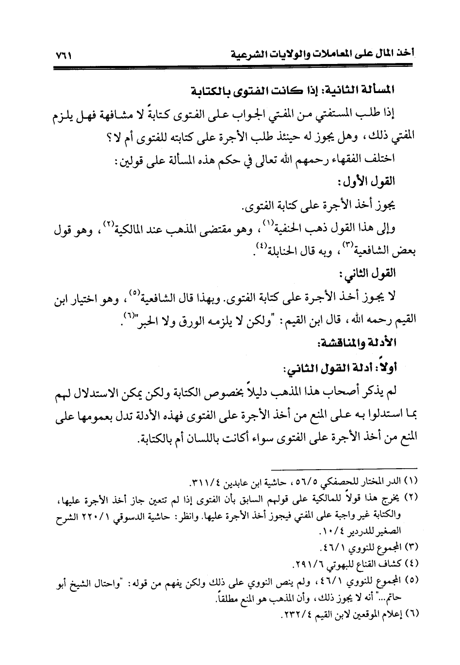 (¬2) يخرج هذا قولًا للمالكية على قولهم السابق بأن الفتوى إذا لم تتعين جاز أخذ الأجرة عليها، والكتابة غير واجبة على المفتي فيجوز أخذ الأجرة عليها. وانظر: حاشية الدسوقي 1/ 220 الشرح الصغير للدردير 4/ 10.