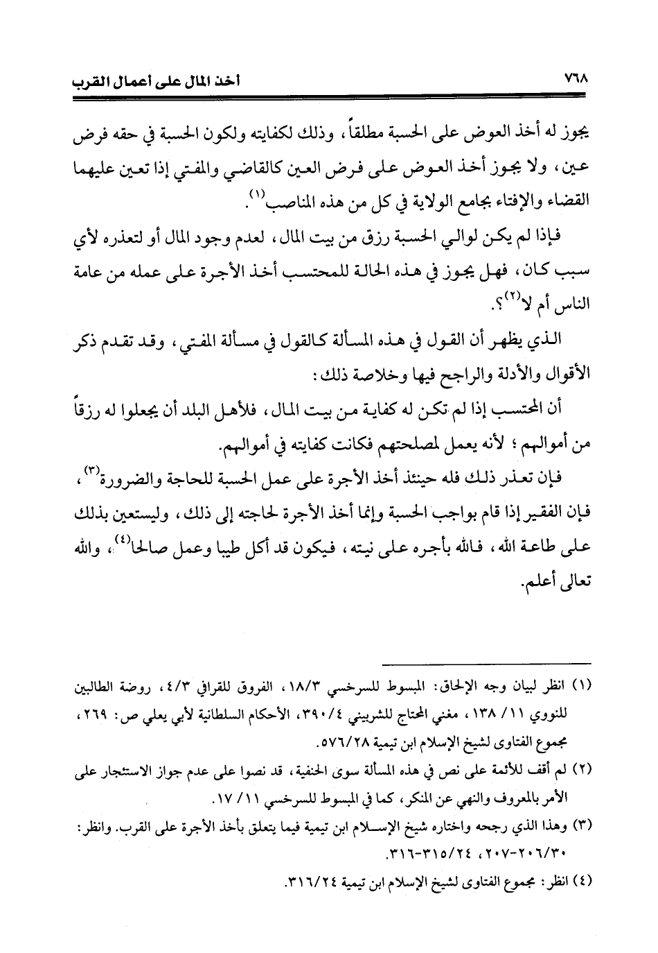 (¬3) وهذا الّذي رجحه واختاره شيخ الإسلام ابن تيمية فيما يتعلّق بأخذ الأجرة على القرب. وانظر: 30/ 206 - 207، 24/ 315 - 316.