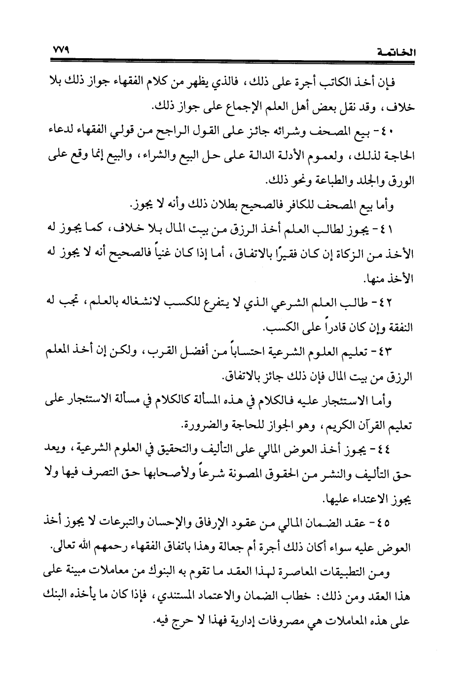 44 - يجوز أخذ العوض المالي على التأليف والتحقيق في العلوم الشرعية، ويعد حق التأليف والنشر من الحقوق المصونة شرعًا ولأصحابها حق التصرف فيها ولا يجوز الاعتداء عليها.