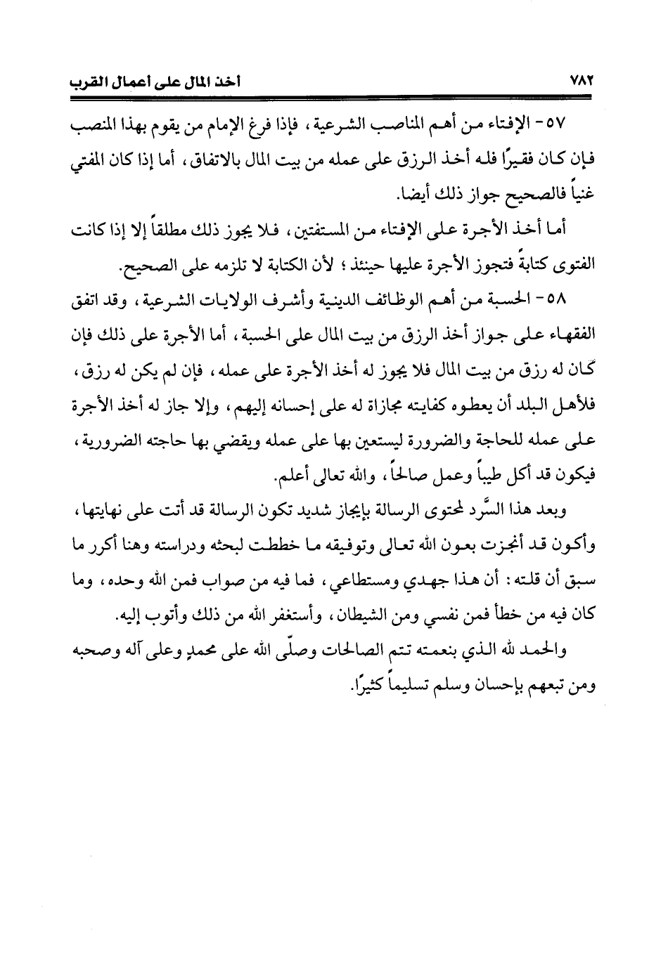 58 - الحسبة من أهم الوظائف الدينية وأشرف الولايات الشرعية، وقد اتفق الفقهاء على جواز أخذ الرزق من بيت المال على الحسبة، أمّا الأجرة على ذلك فإن كان له رزق من بيت المال فلا يجوز له أخذ الأجرة على عمله، فإن لم يكن له رزق، فلأهل البلد أن يعطوه كفايته مجازاة له على إحسانه إليهم، وإلا جاز له أخذ الأجرة على عمله للحاجة والضرورة ليستعين بها على عمله ويقضي بها حاجته الضرورية، فيكون قد أكل طيبًا وعمل صالحًا، والله تعالى أعلم.