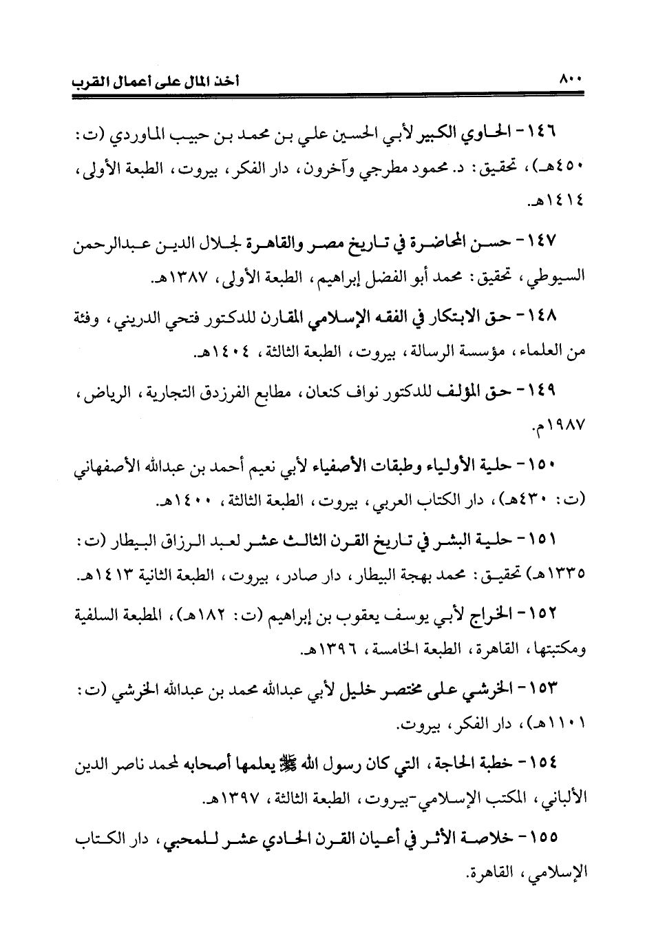 146 - الحاوي الكبير لأبي الحسين علي بن محمَّد بن حبيب الماوردي (ت: 450 هـ)، تحقيق: د. محمود مطرجي وآخرون، دار الفكر، بيروت، الطبعة الأولى، 1414 هـ.