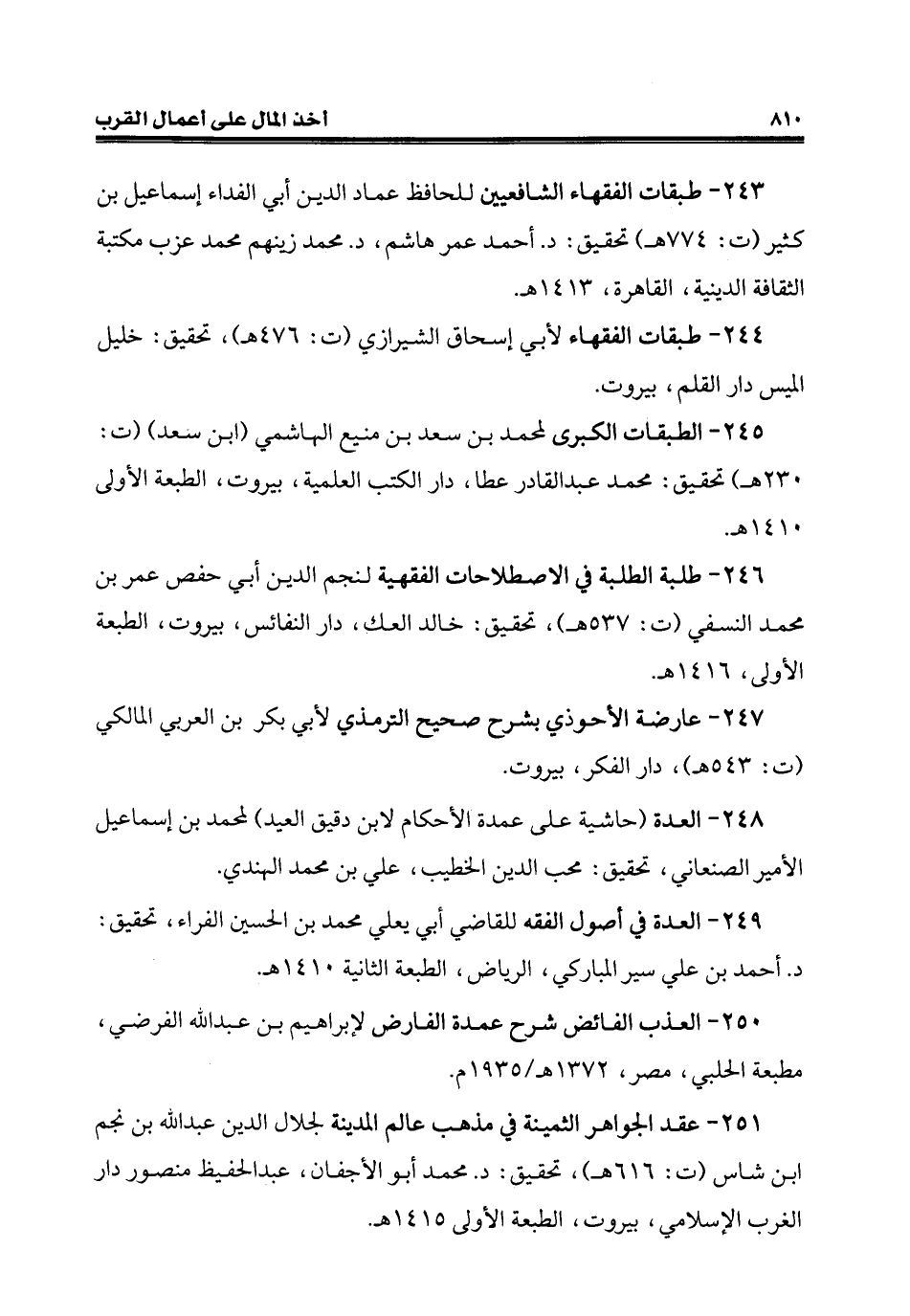 243 - طبقات الفقهاء الشّافعيّين للحافظ عماد الدِّين أبي الفداء إسماعيل بن كثير (ت: 774 هـ) تحقيق: د. أحمد عمر هاشم، د. محمَّد زينهم محمَّد عزب مكتبة الثقافة الدينية، القاهرة، 1413 هـ.