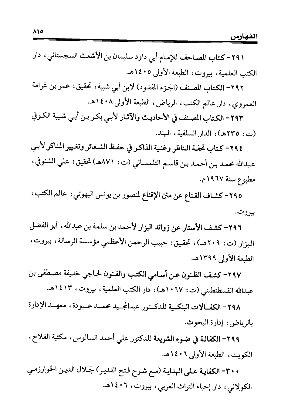 293 - الكتاب المصنِّف في الأحاديث والآثار لأبي بكر بن أبي شيبة الكوفي (ت: 235 هـ)، الدَّار السلفية، الهند.