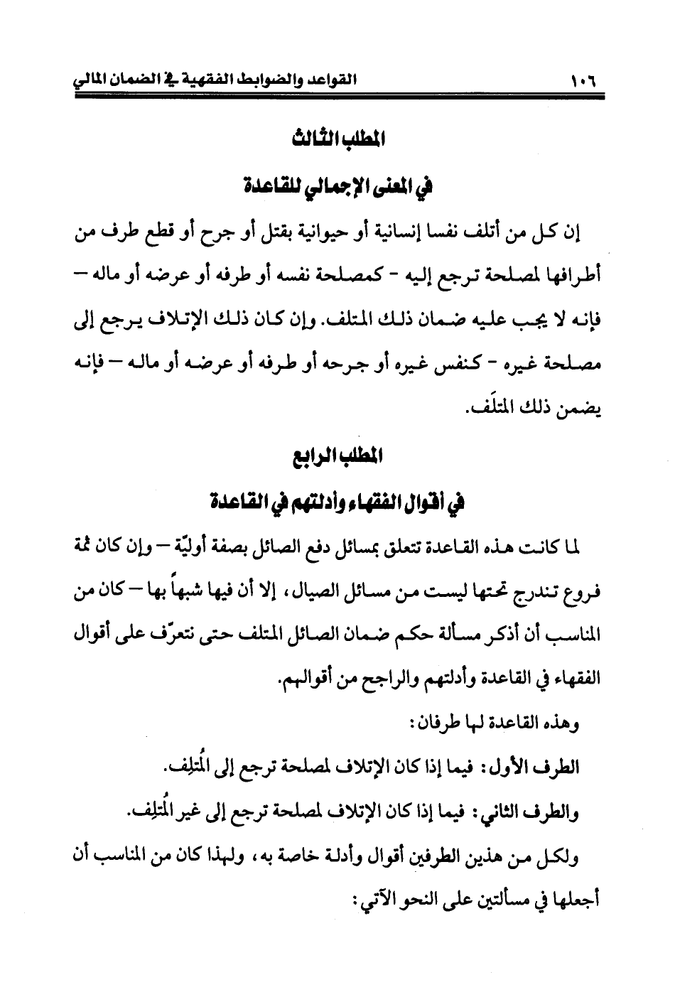 إن كل من أتلف نفسا إنسانية أو حيوانية بقتل أو جرح أو قطع طرف من أطرافها لمصلحة ترجع إليه - كمصلحة نفسه أو طرفه أو عرضه أو ماله - فإنه لا يجب عليه ضمان ذلك المتلف. وإن كان ذلك الإتلاف يرجع إلى مصلحة غيره - كنفس غيره أو جرحه أو طرفه أو عرضه أو ماله - فإنه يضمن ذلك المتلَف.