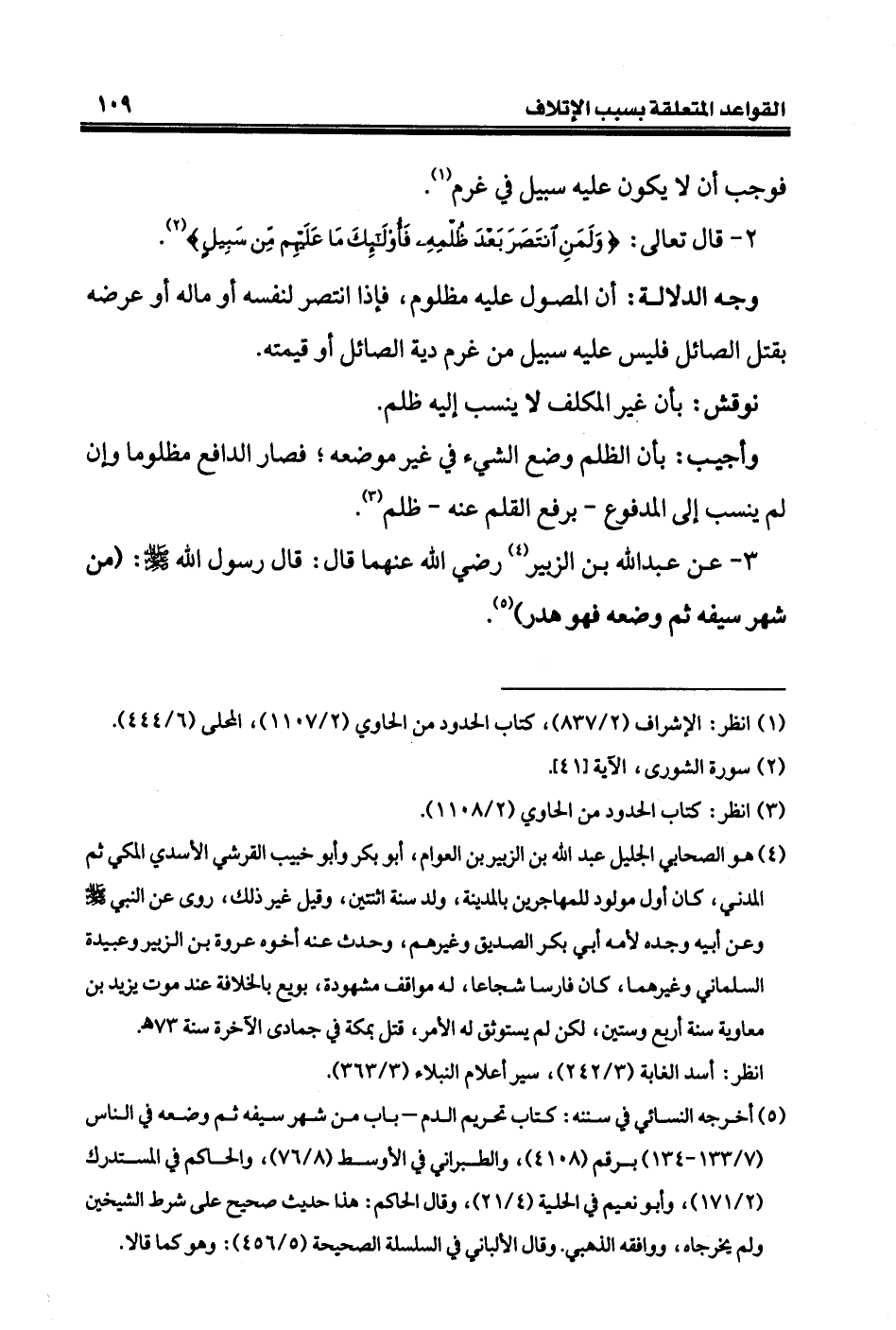 ٣ - عن عبدالله بن الزبير (¬٤) رضي الله عنهما قال: قال رسول الله - صلى الله عليه وسلم -: (من شهر سيفه ثم وضعه فهو هدر) (¬٥).