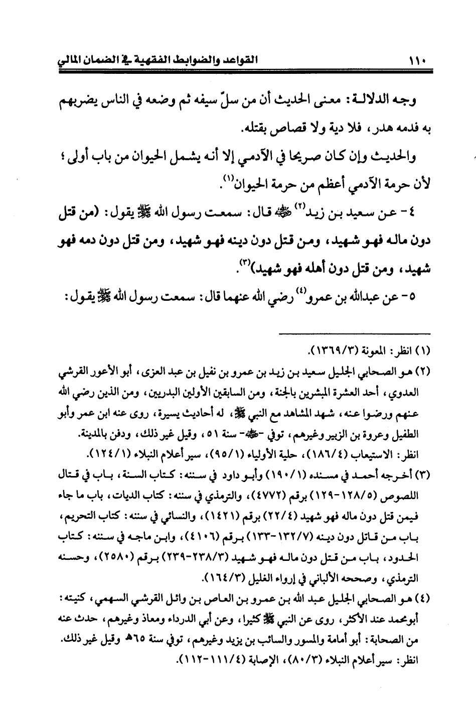٤ - عن سعيد بن زيد (¬٢) - رضي الله عنه - قال: سمعت رسول الله - صلى الله عليه وسلم - يقول: (من قتل دون ماله فهو شهيد، ومن قتل دون دينه فهو شهيد، ومن قتل دون دمه فهو شهيد، ومن قتل دون أهله فهو شهيد) (¬٣).