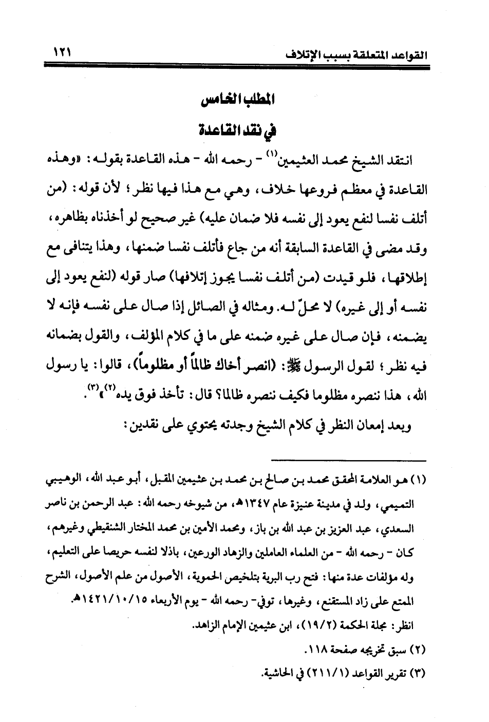 انتقد الشيخ محمد العثيمين (¬١) - رحمه الله - هذه القاعدة بقوله: «وهذه القاعدة في معظم فروعها خلاف، وهي مع هذا فيها نظر؛ لأن قوله: (من أتلف نفسا لنفع يعود إلى نفسه فلا ضمان عليه) غير صحيح لو أخذناه بظاهره، وقد مضى في القاعدة السابقة أنه من جاع فأتلف نفسا ضمنها، وهذا يتنافى مع إطلاقها، فلو قيدت (من أتلف نفسا يجوز إتلافها) صار قوله (لنفع يعود إلى نفسه أو إلى غيره) لا محلّ له. ومثاله في الصائل إذا صال على نفسه فإنه لا يضمنه، فإن صال على غيره ضمنه على ما في كلام المؤلف، والقول بضمانه فيه نظر؛ لقول الرسول - صلى الله عليه وسلم -: (انصر أخاك ظالماً أو مظلوماً)، قالوا: يا رسول الله، هذا ننصره مظلوما فكيف ننصره ظالما؟ قال: تأخذ فوق يده (¬٢)» (¬٣).