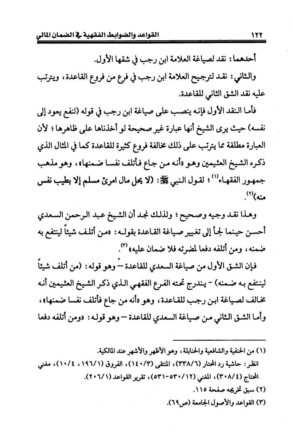 وهذا نقد وجيه وصحيح؛ ولذلك نجد أن الشيخ عبد الرحمن السعدي أحسن حينما لجأ إلى تغيير صياغة القاعدة بقوله: «من أتلف شيئاً لينتفع به ضمنه، ومن أتلفه دفعا لمضرته فلا ضمان عليه» (¬٣).