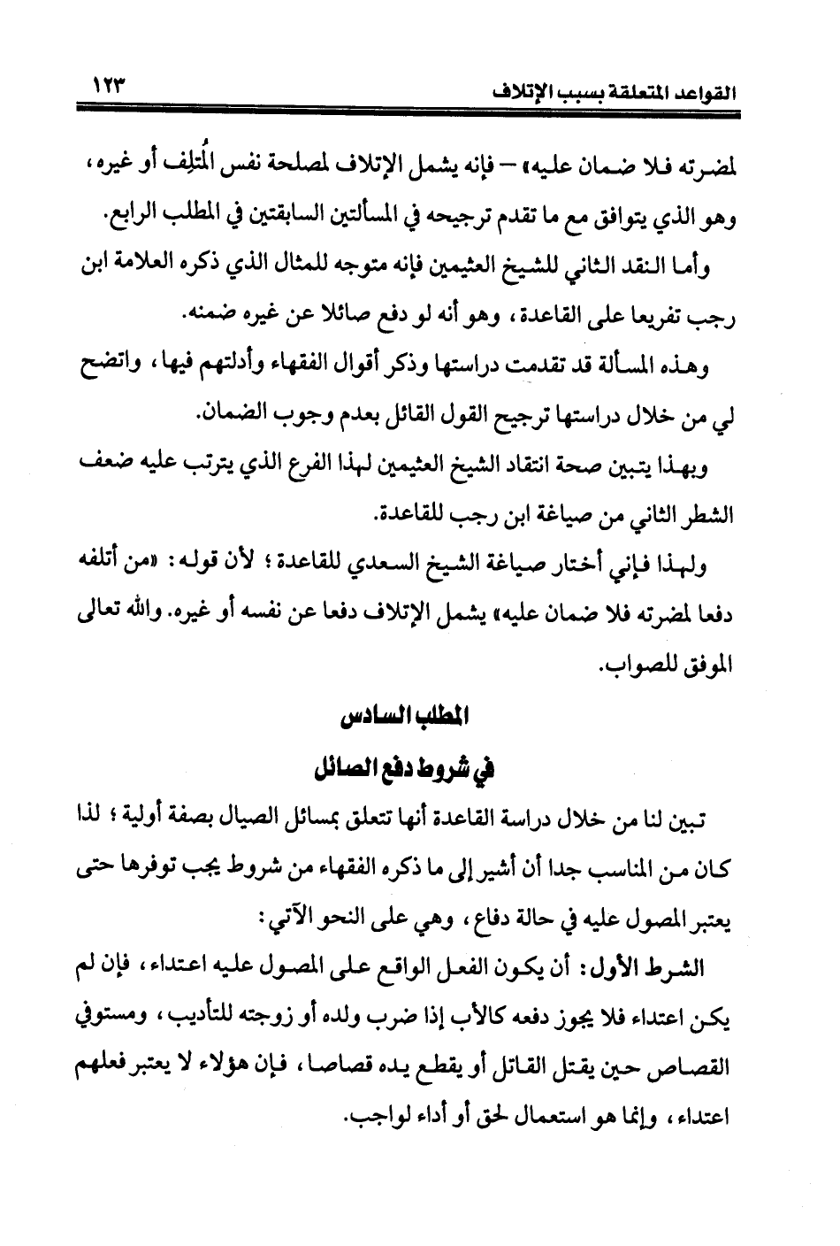 ولهذا فإني أختار صياغة الشيخ السعدي للقاعدة؛ لأن قوله: «من أتلفه دفعا لمضرته فلا ضمان عليه» يشمل الإتلاف دفعا عن نفسه أو غيره. والله تعالى الموفق للصواب.