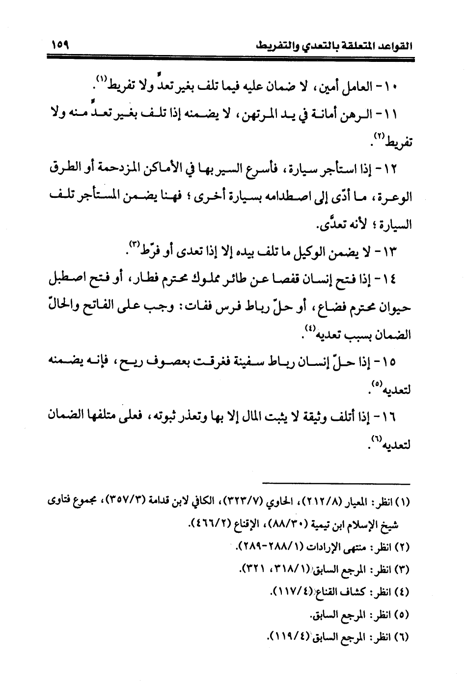 ١٢ - إذا استأجر سيارة، فأسرع السير بها في الأماكن المزدحمة أو الطرق الوعرة، ما أدّى إلى اصطدامه بسيارة أخرى؛ فهنا يضمن المستأجر تلف السيارة؛ لأنه تعدَّى.