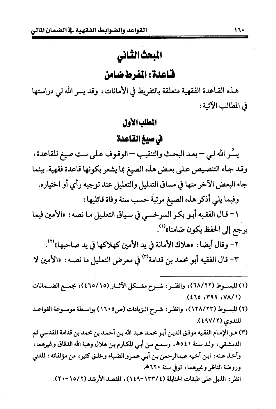 ١ - قال الفقيه أبو بكر السرخسي في سياق التعليل ما نصه: «الأمين فيما يرجع إلى الحفظ يكون ضامنا» (¬١).