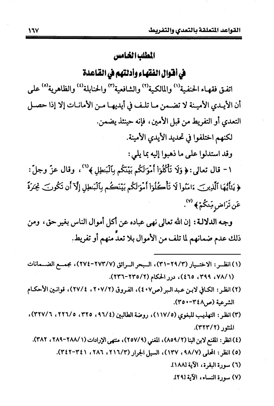 وجه الدلالة: إن الله تعالى نهى عباده عن أكل أموال الناس بغير حق، ومن ذلك عدم ضمانهم لما تلف من الأموال بلا تعدٍّ منهم أو تفريط.