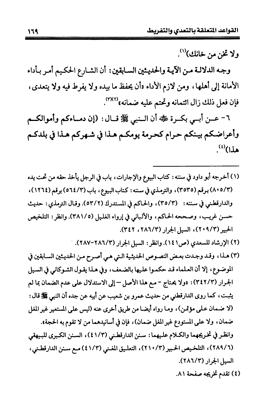 (¬٣) هذا، وقد وجدت بعض النصوص الحديثية التي هي أصرح من الحديثين السابقين في الموضوع، إلا أن العلماء قد حكموا عليها بالضعف، وفي هذا يقول الشوكاني في السيل الجرار (٣/ ٣٤٢): «ولا يحتاج - مع هذا الأصل - إلى الاستدلال على عدم الضمان بما لم يثبت، كما روى الدارقطني من حديث عمرو بن شعيب عن أبيه عن جده أن النبي - صلى الله عليه وسلم - قال: (لا ضمان على مؤتمن)، وما رواه أيضا من طريق أخرى عنه (ليس على المستعير غير المغل ضمان، ولا على المستودع غير المغل ضمان)، فإن في أسانيدهما من لا تقوم به الحجة».