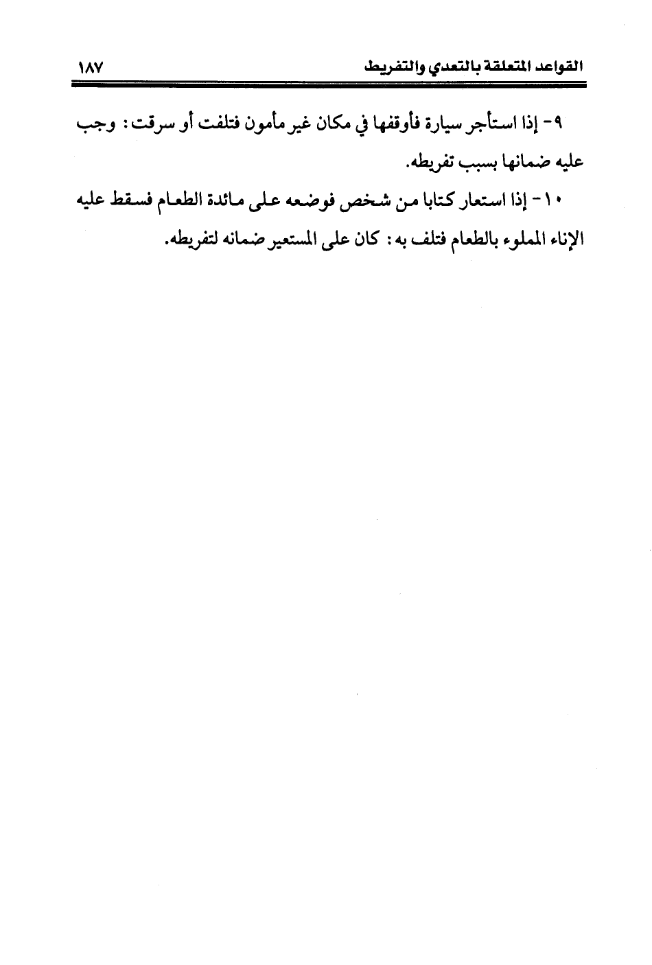 ١٠ - إذا استعار كتابا من شخص فوضعه على مائدة الطعام فسقط عليه الإناء المملوء بالطعام فتلف به: كان على المستعير ضمانه لتفريطه.