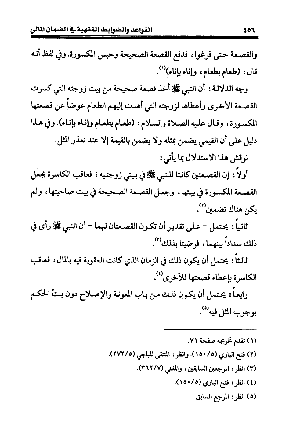 وجه الدلالة: أن النبي - صلى الله عليه وسلم - أخذ قصعة صحيحة من بيت زوجته التي كسرت القصعة الأخرى وأعطاها لزوجته التي أهدت إليهم الطعام عوضاً عن قصعتها المكسورة، وقال عليه الصلاة والسلام: (طعام بطعام وإناء بإناء). وفي هذا دليل على أن القيمي يضمن بمثله ولا يضمن بالقيمة إلا عند تعذر المثل.