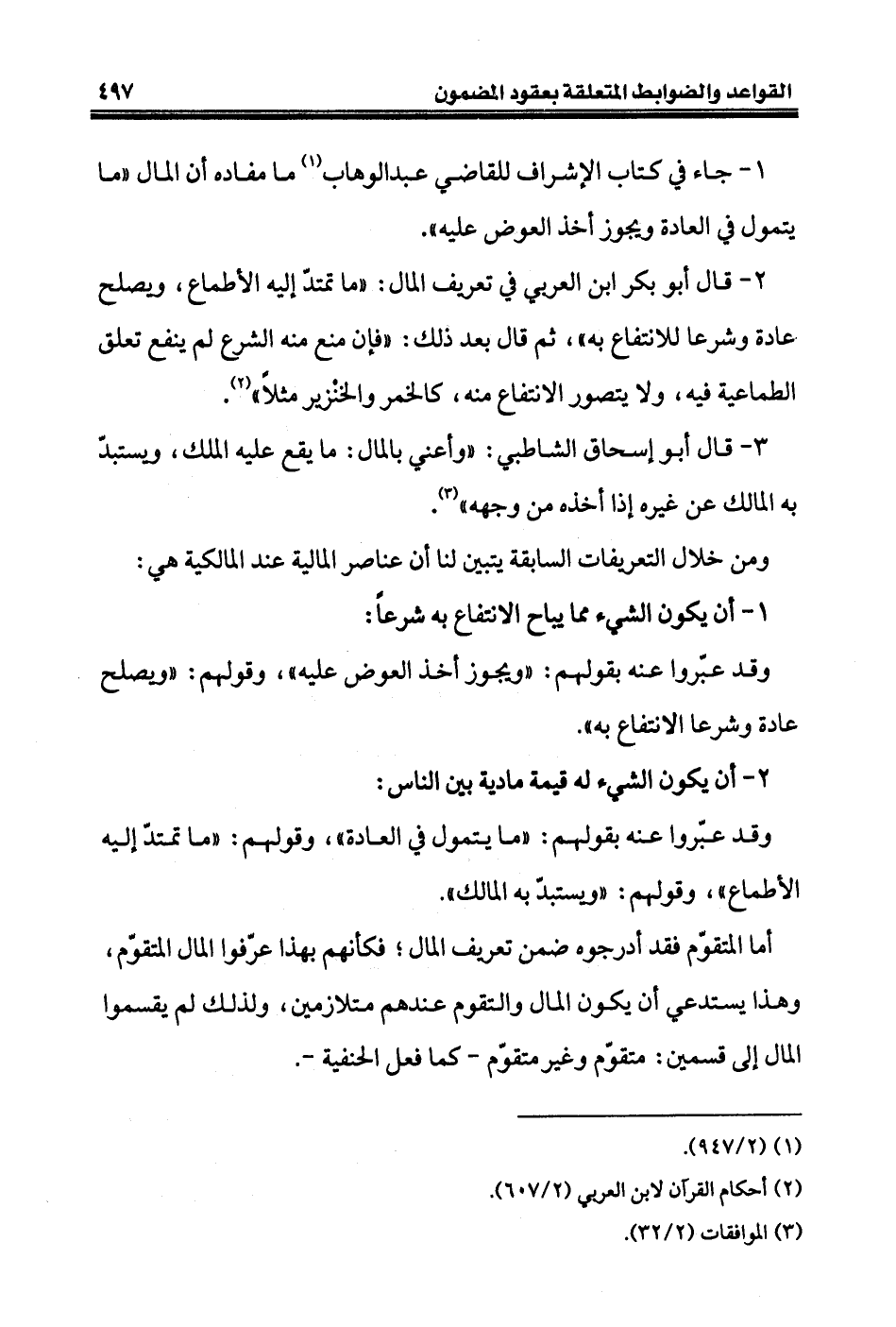 ١ - جاء في كتاب الإشراف للقاضي عبدالوهاب (¬١) ما مفاده أن المال «ما يتمول في العادة ويجوز أخذ العوض عليه».