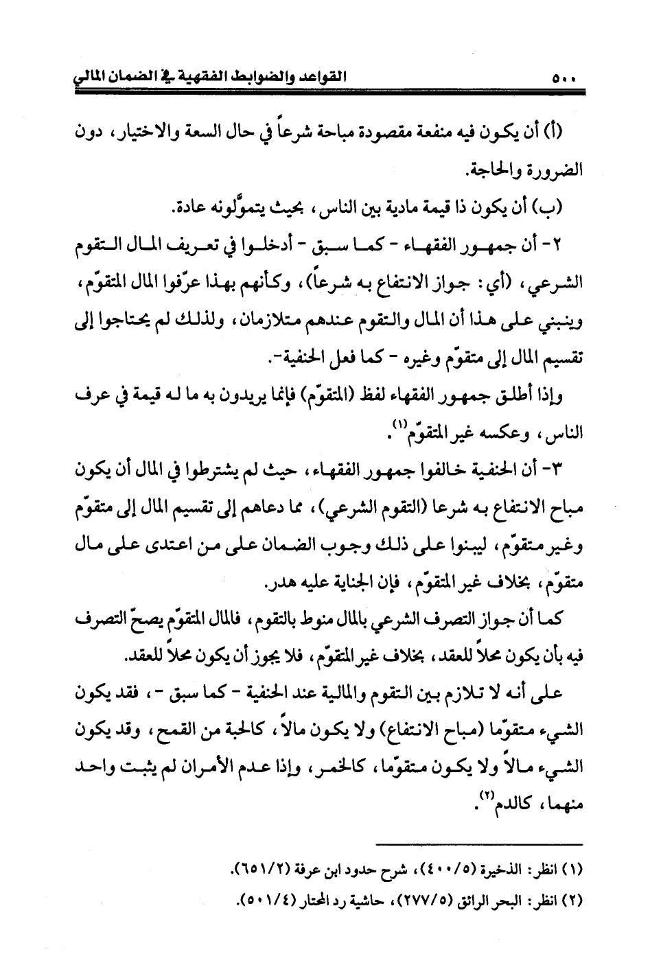 ٣ - أن الحنفية خالفوا جمهور الفقهاء، حيث لم يشترطوا في المال أن يكون مباح الانتفاع به شرعا (التقوم الشرعي)، مما دعاهم إلى تقسيم المال إلى متقوّم وغير متقوّم، ليبنوا على ذلك وجوب الضمان على من اعتدى على مال متقوّم، بخلاف غير المتقوّم، فإن الجناية عليه هدر.