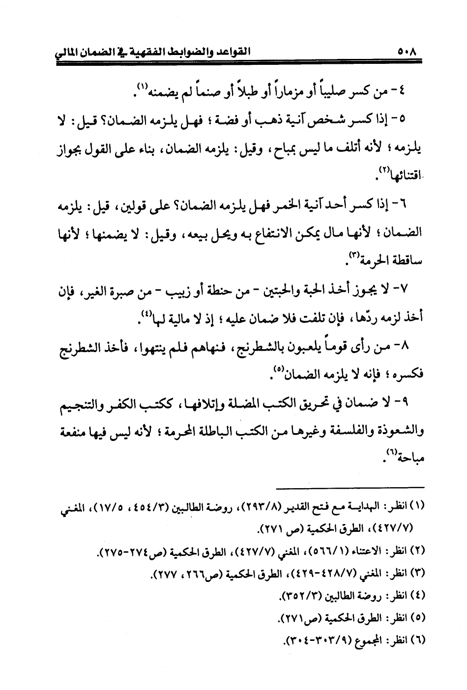 ٩ - لا ضمان في تحريق الكتب المضلة وإتلافها، ككتب الكفر والتنجيم والشعوذة والفلسفة وغيرها من الكتب الباطلة المحرمة؛ لأنه ليس فيها منفعة مباحة (¬٦).