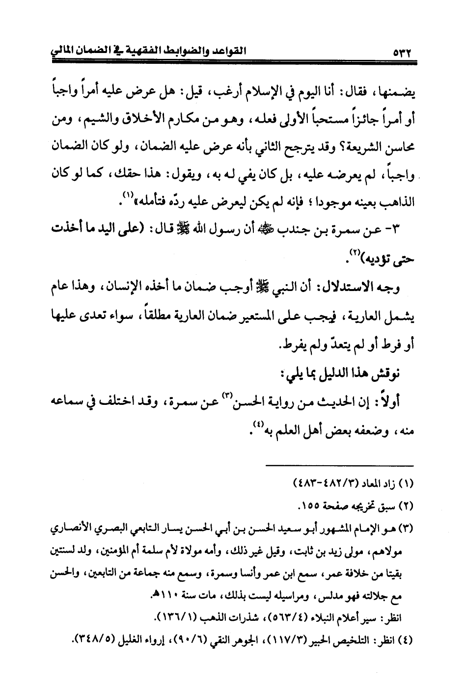٣ - عن سمرة بن جندب - رضي الله عنه - أن رسول الله - صلى الله عليه وسلم - قال: (على اليد ما أخذت حتى تؤديه) (¬٢).