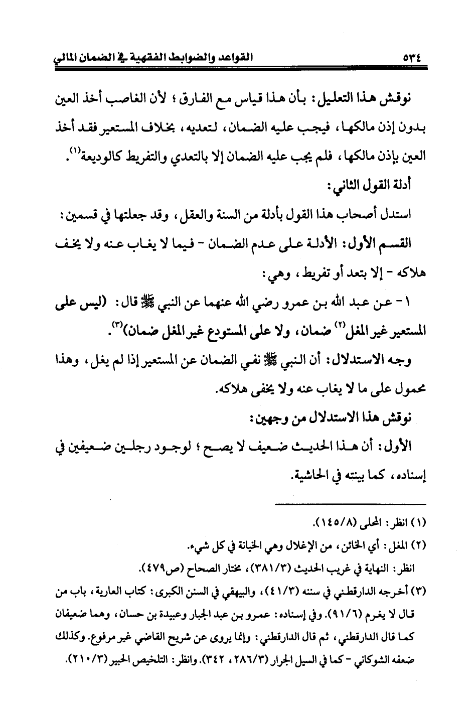 (¬٣) أخرجه الدارقطني في سننه (٣/ ٤١)، والبيهقي في السنن الكبرى: كتاب العارية، باب من قال لا يغرم (٦/ ٩١). وفي إسناده: عمرو بن عبد الجبار وعبيدة بن حسان، وهما ضعيفان كما قال الدارقطني، ثم قال الدارقطني: وإنما يروى عن شريح القاضي غير مرفوع. وكذلك ضعفه الشوكاني - كما في السيل الجرار (٣/ ٢٨٦، ٣٤٢). وانظر: التلخيص الحبير (٣/ ٢١٠).