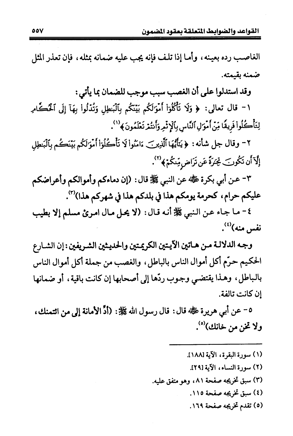 ١ - قال تعالى: {وَلَا تَأْكُلُوا أَمْوَالَكُمْ بَيْنَكُمْ بِالْبَاطِلِ وَتُدْلُوا بِهَا إِلَى الْحُكَّامِ لِتَأْكُلُوا فَرِيقًا مِنْ أَمْوَالِ النَّاسِ بِالْإِثْمِ وَأَنْتُمْ تَعْلَمُونَ}