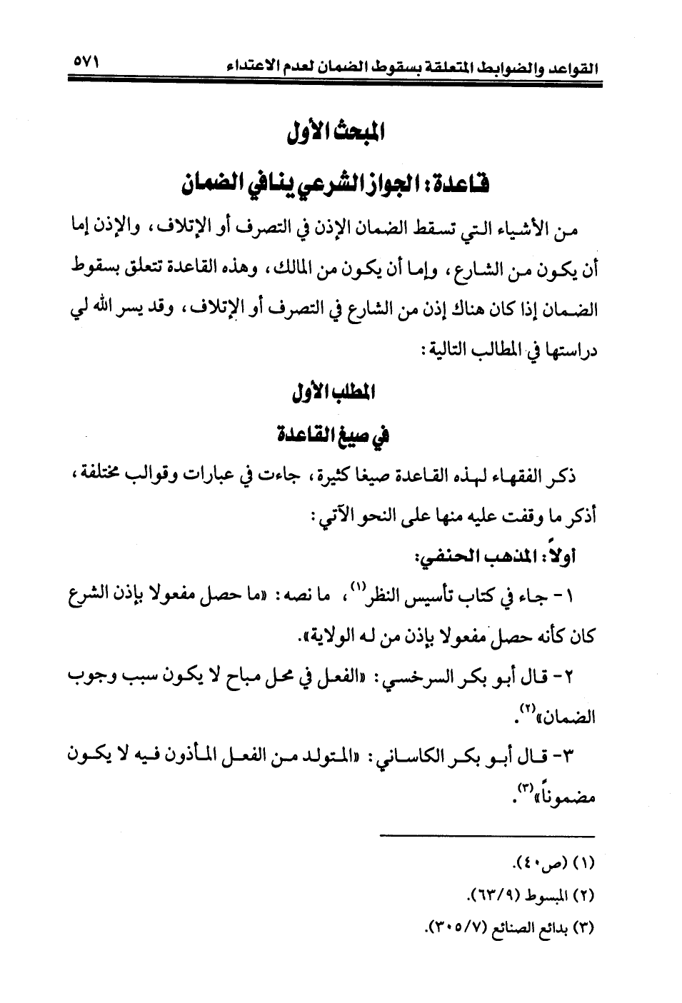 ٢ - قال أبو بكر السرخسي: «الفعل في محل مباح لا يكون سبب وجوب الضمان» (¬٢).