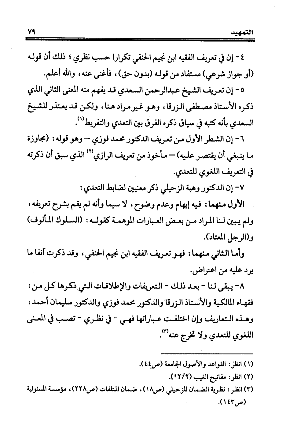 ٥ - إن تعريف الشيخ عبدالرحمن السعدي قد يفهم منه المعنى الثاني الذي ذكره الأستاذ مصطفى الزرقا، وهو غير مراد هنا، ولكن قد يعتذر للشيخ السعدي بأنه كتبه في سياق ذكره الفرق بين التعدي والتفريط (¬١).