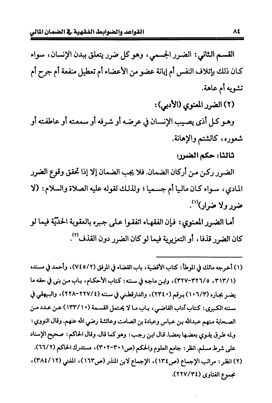 القسم الثاني: الضرر الجسمي، وهو كل ضرر يتعلق ببدن الإنسان، سواء كان ذلك بإتلاف النفس أم إبانة عضو من الأعضاء أم تعطيل منفعة أم جرح أم تشويه أم عاهة.