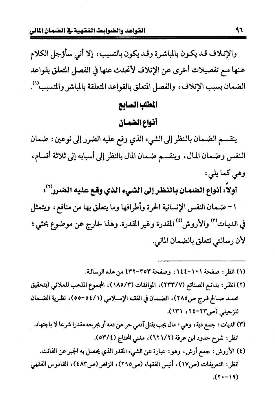 (¬٢) انظر: بدائع الصنائع (٧/ ٢٣٣)، الموافقات (٣/ ١٨٥)، المجموع المذهب للعلائي (بتحقيق محمد صالح فرج ص ٢٨٥)، الضمان في الفقه الإسلامي (١/ ٥٤ - ٥٥)، نظرية الضمان للزحيلي (ص ٢٣ - ٢٤، ١٣١).
