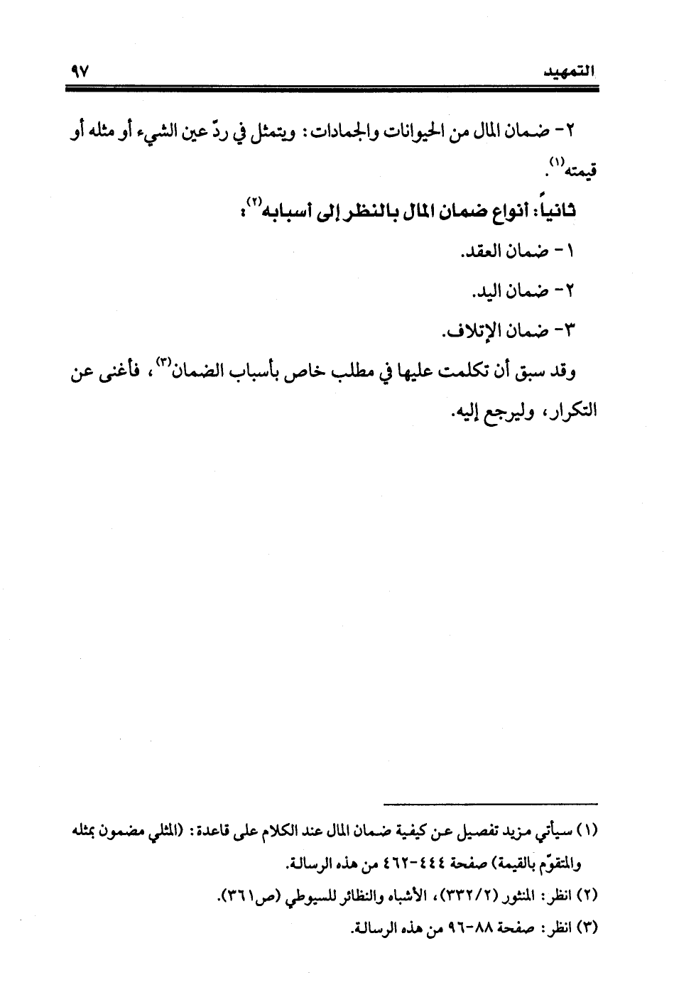 (¬١) سيأتي مزيد تفصيل عن كيفية ضمان المال عند الكلام على قاعدة: (المثلي مضمون بمثله والمتقوّم بالقيمة) صفحة ٤٤٤ - ٤٦٢ من هذه الرسالة.