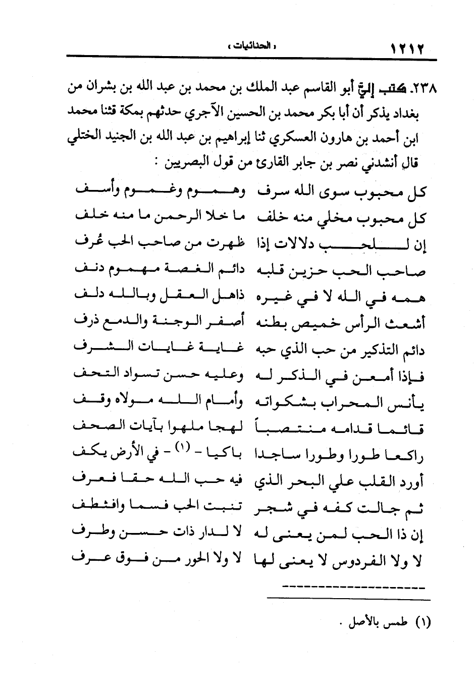238-[247] كتب إلي أبو القاسم عَبْدُ الْمَلِكِ بْنُ مُحَمَّدِ بْنِ عَبْدِ اللَّهِ بن بشران مِنْ بَغْدَادَ يَذْكُرُ أَنَّ أَبَا بَكْرٍ مُحَمَّدَ بن الحسين الآجري حدثهم بمكة قال: ثنا محمد بن أحمد بن هارون العسكري ثنا إبراهيم بن عبد الله بن الجنيد الختلي قال أنشدني نصر بن جابر القارئ من قول البصريين:
