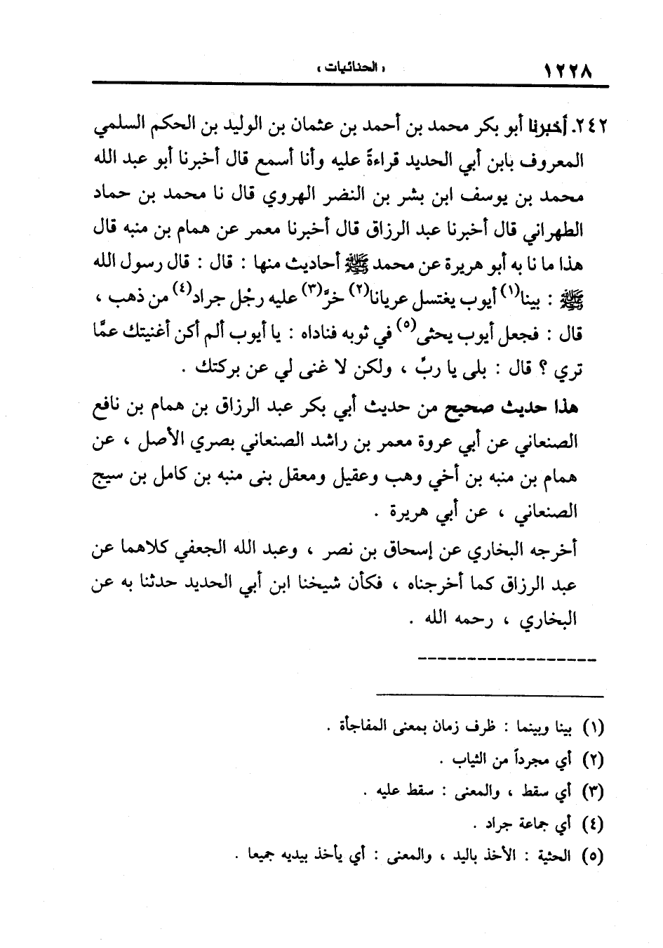 242-[251] أَخْبَرَنَا أَبُو بَكْرٍ مُحَمَّدُ بْنُ أَحْمَدَ بْنِ عُثْمَانَ بْنِ الْوَلِيدِ بْنِ الْحَكَمِ السُّلَمِيُّ الْمَعْرُوفُ بِابْنِ أَبِي الْحَدِيدِ قِرَاءَةً عَلَيْهِ وَأَنَا أَسْمَعُ قَالَ أَخْبَرَنَا أَبُو عَبْدِ اللَّهِ مُحَمَّدُ بْنُ يُوسُفَ بْنِ بِشْرِ بْنِ النَّضْرِ الْهَرَوِيُّ قَالَ نا مُحَمَّدُ بْنُ حَمَّادٍ الطَّهْرَانِيُّ قَالَ أَخْبَرَنَا عَبْدُ الرَّزَّاقِ قَالَ أَخْبَرَنَا مَعْمَرٌ عَنْ هَمَّامِ بْنِ مُنَبِّهٍ قَالَ هَذَا ما حدثنا به أَبُو هُرَيْرَةَ عَنْ مُحَمَّدٍ صَلَّى اللَّهُ عَلَيْهِ وَسَلَّمَ أَحَادِيثَ مِنْهَا: قَالَ: قَالَ رَسُولُ اللَّهِ صَلَّى اللَّهُ عَلَيْهِ وَسَلَّمَ: بَيْنَا أَيُّوبُ يَغْتَسِلُ عُرْيَانًا خَرَّ عَلَيْهِ رِجْلُ جَرَادٍ مِنْ ذَهَبٍ قَالَ: فَجَعَلَ أَيُّوبُ يَحْثِي فِي ثَوْبِهِ فَنَادَاهُ: يَا أَيُّوبُ أَلَمْ أَكُنْ أَغْنَيْتُكَ عَمَّا تَرَى؟ قَالَ: بَلَى يَا رَبِّ وَلَكِنْ لا غِنَى لي عَنْ بَرَكَتِكَ.
