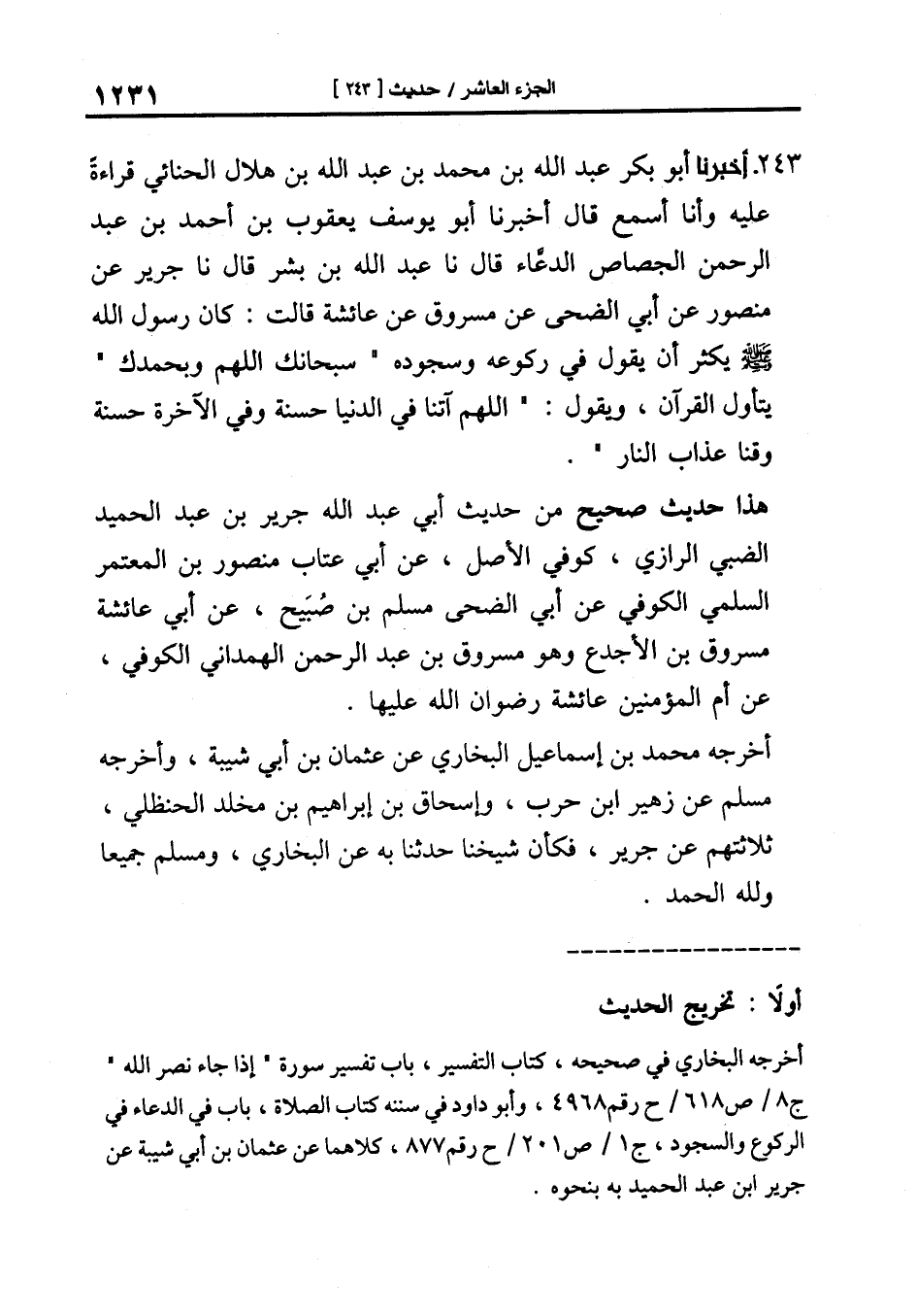 243-[252] أَخْبَرَنَا أَبُو بَكْرٍ عَبْدُ اللَّهِ بْنُ مُحَمَّدِ بْنِ عَبْدِ اللَّهِ بْنِ هِلَالٍ الْحِنَّائِيُّ قِرَاءَةً عَلَيْهِ وَأَنَا أَسْمَعُ قَالَ أَخْبَرَنَا أَبُو يُوسُفَ يَعْقُوبُ بْنُ أَحْمَدَ بْنِ عَبْدِ الرَّحْمَنِ الْجَصَّاصُ الدَّعَّاءُ قَالَ نا عَبْدُ اللَّهِ بْنُ بِشْرٍ قَالَ نا جَرِيرٌ عَنْ مَنْصُورٍ عَنْ أَبِي الضُّحَى عَنْ مَسْرُوقٍ عَنْ عَائِشَةَ قَالَتْ: كَانَ رَسُولُ اللَّهِ صَلَّى اللَّهُ عَلَيْهِ وَسَلَّمَ يَكْثُرُ أَنْ يَقُولَ فِي رُكُوعِهِ وَسُجُودِهِ " سُبْحَانَكَ اللَّهُمَّ وَبِحَمْدِكَ " يَتَأَوَّلُ الْقُرْآنَ وَيَقُولُ: " اللَّهُمَّ آتِنَا فِي الدُّنْيَا حَسَنَةً وَفِي الآخِرَةِ حَسَنَةً وَقِنَا عَذَابَ النَّارِ ".