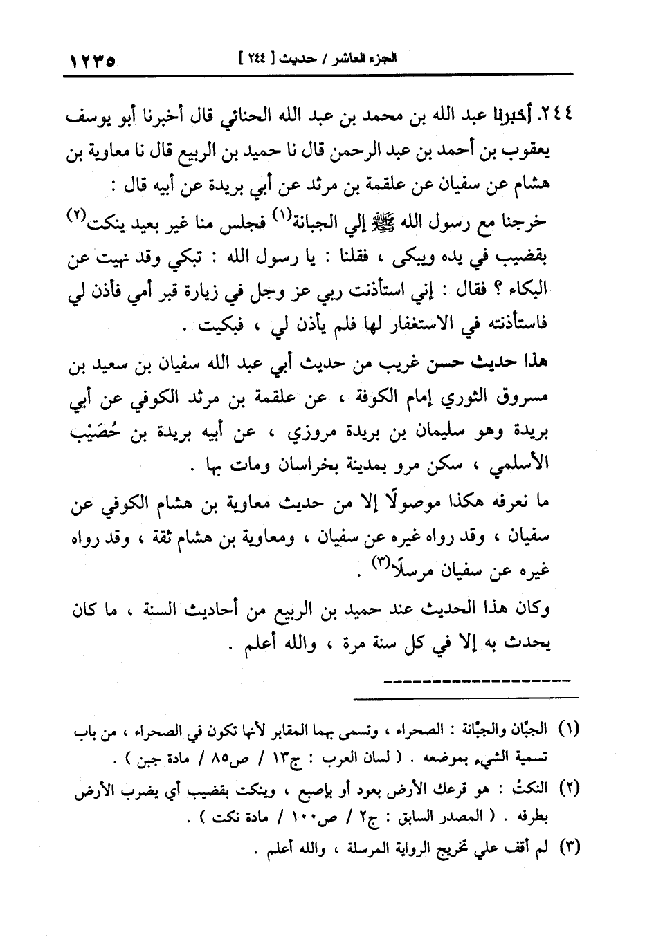 خَرَجْنَا مَعَ رَسُولِ اللَّهِ صَلَّى اللَّهُ عَلَيْهِ وَسَلَّمَ إِلَى الْجَبَّانَةِ فَجَلَسَ مِنَّا غَيْرَ بَعِيدٍ يَنْكُتُ بِقَضِيبٍ فِي يَدِهِ وَيَبْكِي فَقُلْنَا: يَا رَسُولَ اللَّهِ: تَبْكِي وَقَدْ نَهَيْتَ عَنِ الْبُكَاءِ؟ فَقَالَ: إني استأذنت ربي عز وجل فِي زِيَارَةِ قَبْرِ أُمِّي فَأَذِنَ لِي فَاسْتَأْذَنْتُهُ فِي الاسْتِغْفَارِ لَهَا فَلَمْ يَأْذَنْ لِي فَبَكَيْتُ.