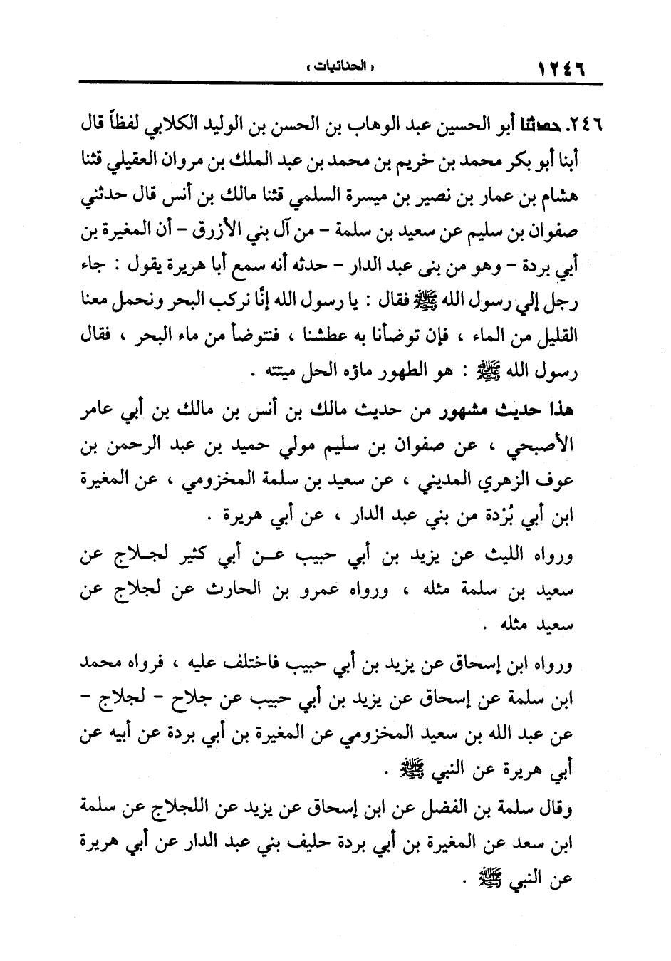246-[255] حَدَّثَنَا أَبُو الْحُسَيْنِ عَبْدُ الْوَهَّابِ بْنُ الْحَسَنِ بْنِ الوليد الكلابي لفظا قال أبنا أَبُو بَكْرٍ مُحَمَّدُ بْنُ خُرَيْمِ بْنِ مُحَمَّدِ بْنِ عَبْدِ الْمَلِكِ بْنِ مَرْوَانَ الْعُقَيْلِيُّ قَالَ: ثنا هِشَامُ بْنُ عَمَّارِ بْنِ نُصَيْرِ بْنِ مَيْسَرَةَ السلمي قال: ثنا مَالِكُ بْنُ أَنَسٍ قَالَ حَدَّثَنِي صَفْوَانُ بْنُ سُلَيْمٍ عَنْ سَعِيدِ بْنِ سَلَمَةَ مِنْ آلِ بَنِي الأَزْرَقِ أَنَّ الْمُغِيرَةَ بْنَ أَبِي بُرْدَةَ وَهُوَ مِنْ بَنِي عَبْدِ الدَّارِ حَدَّثَهُ أَنَّهُ سَمِعَ أَبَا هُرَيْرَةَ يَقُولُ: جَاءَ رَجُلٌ إِلَى رَسُولُ اللَّهِ صَلَّى اللَّهُ عَلَيْهِ وَسَلَّمَ فَقَالَ: يَا رَسُولَ اللَّهِ إَنَّا نَرْكَبُ الْبَحَرْ وَنَحْمِلُ مَعَنَا الْقَلِيلَ مِنَ الْمَاءِ فَإِنْ تَوَضَّأْنَا بِهِ عَطِشْنَا فَنَتَوَضَّأُ مِنْ مَاءِ الْبَحْرِ فَقَالَ رَسُولُ اللَّهِ صَلَّى اللَّهُ عَلَيْهِ وَسَلَّمَ: هُوَ الطَّهُورُ ماؤه الحل ميتته.