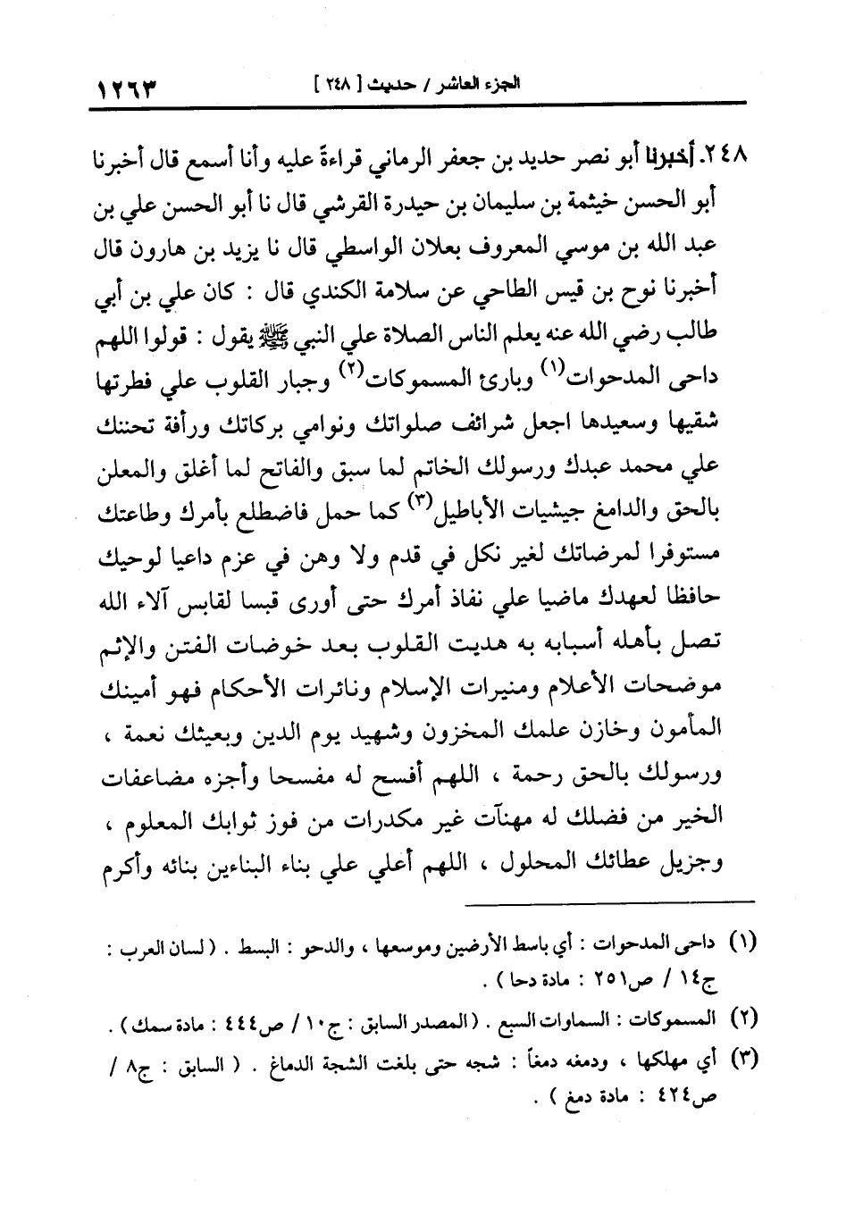 248-[257] أَخْبَرَنَا أَبُو نَصْرٍ حَدِيدُ بْنُ جَعْفَرٍ الرُّمَّانِيُّ قِرَاءَةً عَلَيْهِ وَأَنَا أَسْمَعُ قَالَ أَخْبَرَنَا أَبُو الْحَسَنِ خَيْثَمَةُ بْنُ سُلَيْمَانَ بْنِ حَيْدَرَةَ الْقُرَشِيُّ قال نا أَبُو الْحَسَنِ عَلِيُّ بْنُ عَبْدِ اللَّهِ بن موسى المعروف بعلان الواسطي قال نا يَزِيدُ بْنُ هَارُونَ قَالَ أَخْبَرَنَا نُوحُ بْنُ قَيْسٍ الطَّاحِيُّ عَنْ سَلامَةَ الْكِنْدِيِّ قَالَ: كَانَ عَلِيُّ بْنُ أَبِي طَالِبٍ رَضِيَ اللَّهُ عَنْهُ يُعَلِّمُ النَّاسَ الصَّلاةَ عَلَى النَّبِيِّ صَلَّى اللَّهُ عَلَيْهِ وَسَلَّمَ يَقُولُ: قُولُوا اللَّهُمَّ دَاحِيَ الْمَدْحُوَّاتِ وَبَارِئَ الْمَسْمُوكَاتِ وَجَبَّارَ الْقُلُوبِ عَلَى فِطْرَتِهَا شَقِيِّهَا وسعيدها اجعل شرائف صلواتك ونوامي بركاتك ورأفة تحننك عَلَى مُحَمَّدٍ عَبْدِكَ وَرَسُولِكَ الْخَاتَمِ لِمَا سَبَقَ وَالْفَاتِحِ لِمَا أُغْلِقَ وَالْمُعْلِنِ بِالْحَقِّ وَالدَّامِغِ جَيْشَاتِ الأَبَاطِيلِ كَمَا حُمِّلَ فَاضْطَلَعَ بِأَمْرِكَ وَطَاعَتِكَ مُسْتَوْفِزًا لِمَرْضَاتِكَ لِغَيْرِ نَكَلٍ فِي قَدَمٍ وَلا وَهَنٍ فِي عَزْمٍ دَاعِيًا لِوَحْيِكَ حَافِظًا لِعَهْدِكَ مَاضِيًا عَلَى نَفَاذِ أَمْرِكَ حَتَّى أَوْرَى قَبَسًا لِقَابِسٍ آلاءُ اللَّهِ تَصِلُ بِأَهْلِهِ أَسْبَابَهُ بِهِ هُدِيَتِ الْقُلُوبُ بَعْدَ خَوْضَاتِ الْفِتَنِ وَالإِثْمِ مُوَضَّحَاتِ الأَعْلامِ وَمُنِيرَاتِ الإِسْلامِ وَنَائِرَاتِ الأَحْكَامِ فَهُوَ أَمِينُكَ الْمَأْمُونُ وَخَازِنُ عِلْمِكَ الْمَخْزُونُ وَشَهِيدُكَ يَوْمَ الدِّينِ وَبَعِيثُكَ نِعْمَةً وَرَسُولُكَ بِالْحَقِّ رَحْمَةً اللَّهُمَّ أفْسِحْ لَهُ مفسحا وَاجْزِهِ مُضَاعَفَاتِ الْخَيْرِ مِنْ فَضْلِكَ لَهُ مُهَنَّآتٍ غَيْرَ مُكَدَّرَاتٍ مِنْ فَوْزِ ثَوَابِكَ الْمَعْلُومِ وَجَزِيلِ عطائك المحلول اللهم أعلي (¬1) على بناء البناءين بنائه وأكرم -[1264]- مثواه لديك ونزله وأعم [له] (¬2) نوره وأجزه من ابتغائك له مقبول الشهادة مرضي المقالة ذا منطق عَدْلٍ وَخَطُّهُ فَصْلٌ [وَحُجَّةٌ] (¬3) وَبُرْهَانٌ عَظِيمٌ.