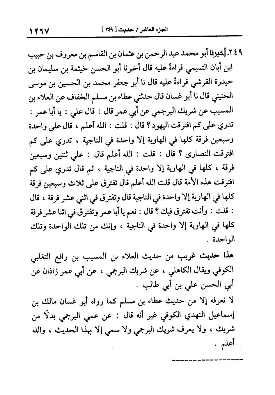 249-[258] أَخْبَرَنَا أَبُو مُحَمَّدٍ عَبْدُ الرَّحْمَنِ بْنُ عُثْمَانَ بْنِ الْقَاسِمِ بْنِ مَعْرُوفِ بْنِ حَبِيبِ بْنِ أَبَانٍ التَّمِيمِيُّ قِرَاءَةً عَلَيْهِ قَالَ أَخْبَرَنَا أَبُو الْحَسَنِ خَيْثَمَةُ بْنُ سُلَيْمَانَ بْنِ حَيْدَرَةَ الْقُرَشِيُّ قِرَاءَةً عَلَيْهِ قَالَ نا أَبُو جَعْفَرٍ مُحَمَّدُ بْنُ الْحُسَيْنِ بْنِ مُوسَى الْحُنَيْنِيُّ قَالَ نا أَبُو غَسَّانَ قَالَ حَدَّثَنِي عَطَاءُ بْنُ مُسْلِمٍ الْخَفَّافُ عَنِ الْعَلاءِ بْنِ الْمُسَيَّبِ عَنْ شَرِيكٍ الْبُرْجُمِيِّ عَنْ أَبِي عُمَرَ قَالَ: قَالَ عَلِيٌّ: يَا أَبَا عُمَرَ: تَدْرِي عَلَى كَمِ افْتَرَقَتِ الْيَهُودُ؟ قَالَ: قُلْتُ: اللَّهُ أَعْلَمُ قَالَ عَلِيٌّ وَاحِدَةً وَسَبْعِينَ فِرْقَةً كُلُّهَا فِي الْهَاوِيَةِ إِلا وَاحِدَةً فِي النَّاجِيَةِ تَدْرِي عَلَى كَمِ افْتَرَقَتِ النَّصَارَى؟ قَالَ: قُلْتُ: اللَّهُ أَعْلَمُ قَالَ: عَلَى ثِنْتَيْنِ وَسَبْعِينَ فِرْقَةً كُلُّهَا فِي الْهَاوِيَةِ إِلا وَاحِدَةً فِي النَّاجِيَةِ ثُمَّ قَالَ تَدْرِي عَلَى كَمِ افْتَرَقَتْ هَذِهِ الأُمَّةُ قَالَ قُلْتُ اللَّهُ أَعْلَمُ قَالَ تَفْتَرِقُ عَلَى ثَلاثٍ وَسَبْعِينَ فِرْقَةً كُلُّهَا فِي الْهَاوِيَةِ إِلا وَاحِدَةً فِي النَّاجِيَةِ قال وتفترق في اثني عشر فرقة قال: قلت: وأنت تفترق فِيكَ؟ قَالَ: نَعَمْ يَا أَبَا عُمَرَ تَفْتَرِقُ فِيَّ اثْنَا عَشَرَ فِرْقَةً كُلُّهَا فِي الْهَاوِيَةِ إِلا وَاحِدَةً فِي النَّاجِيَةِ وَإِنَّكَ مِنْ تِلْكَ الْوَاحِدَةِ وَتِلْكَ الْوَاحِدَةِ.